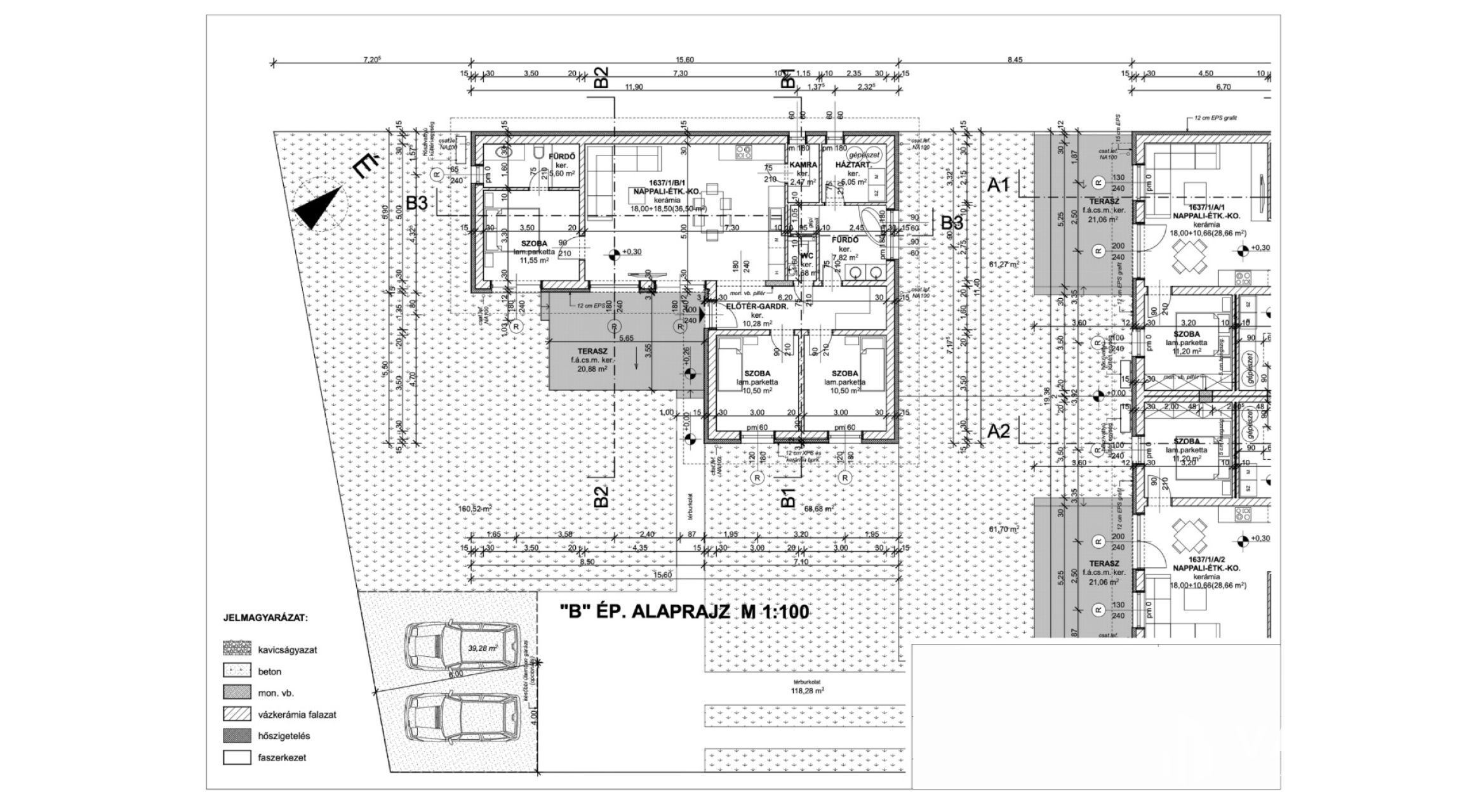 Kert: 434 m2 udvar, melyből dupla autóbeálló: 39,28 m2