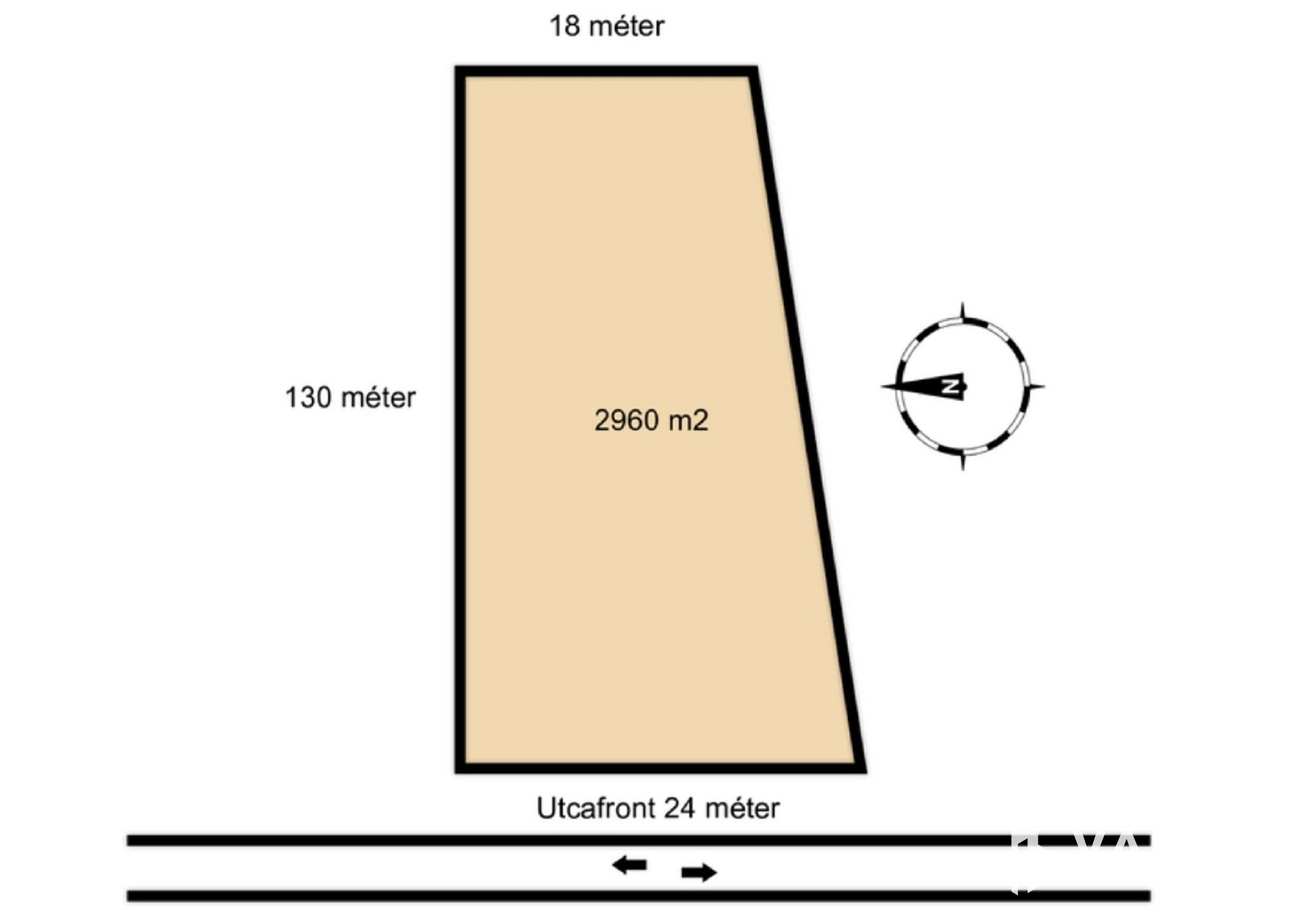 A telek domboldalban található, utcafront 24 méter, telek felső vége 18 méter, telek hossza 130 méter.