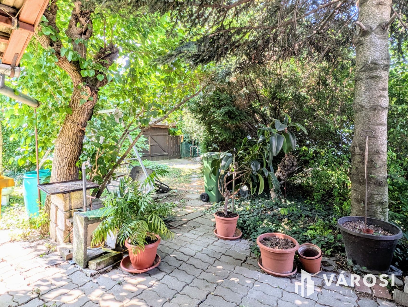 Egy melléképület és egy garázs is található a körülkerített kertben.
