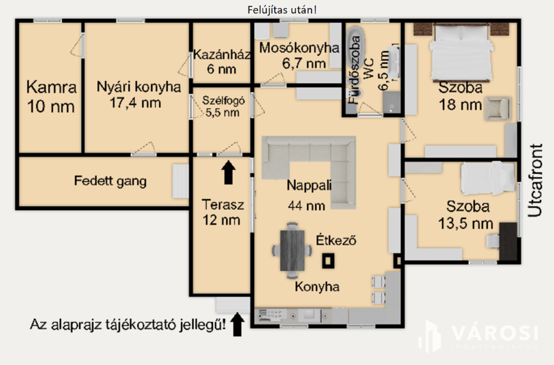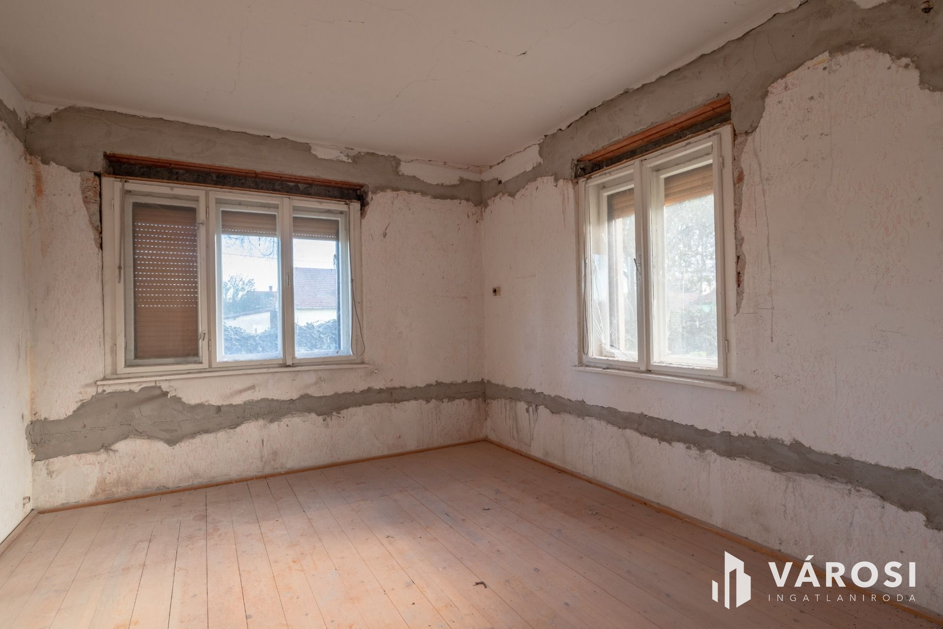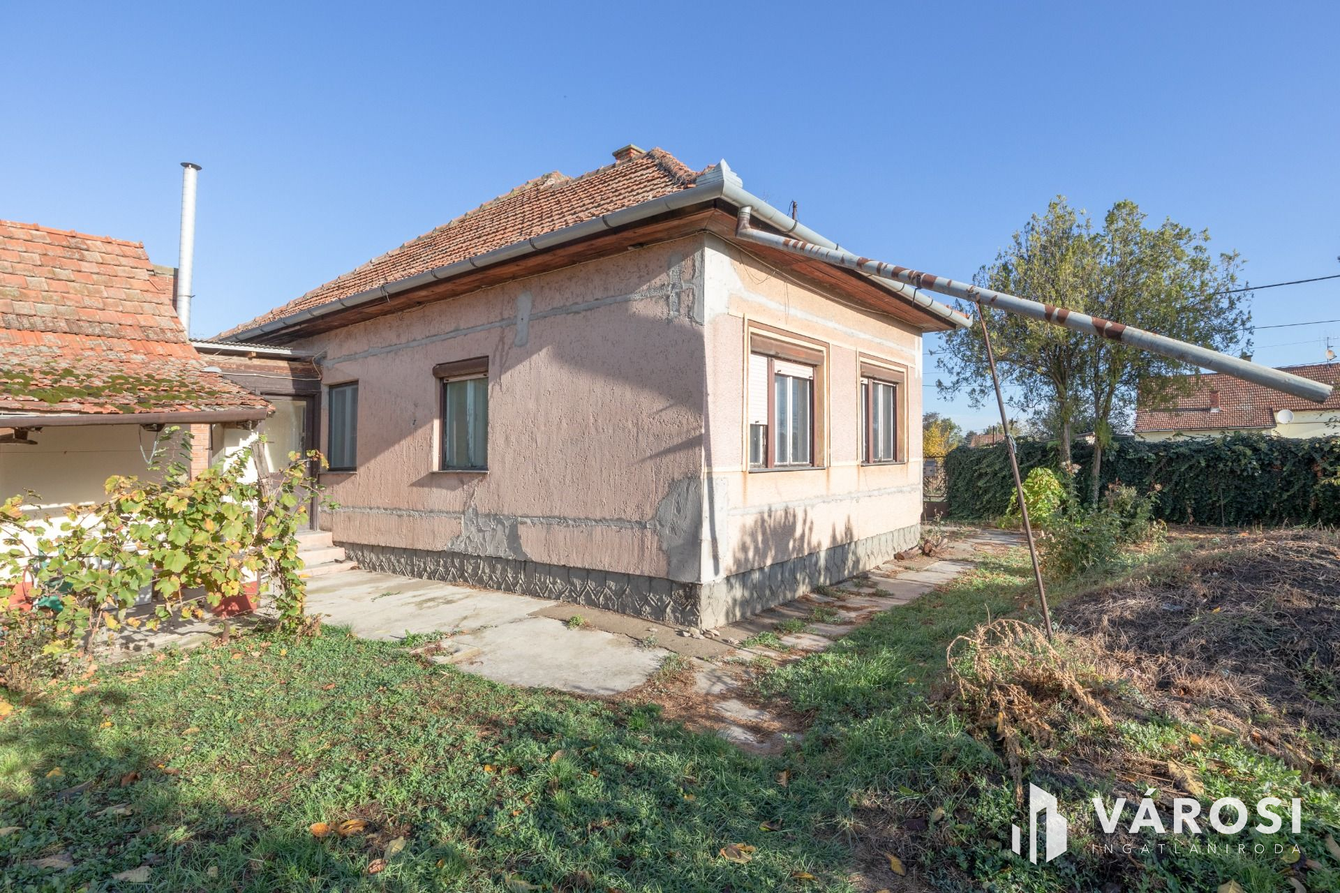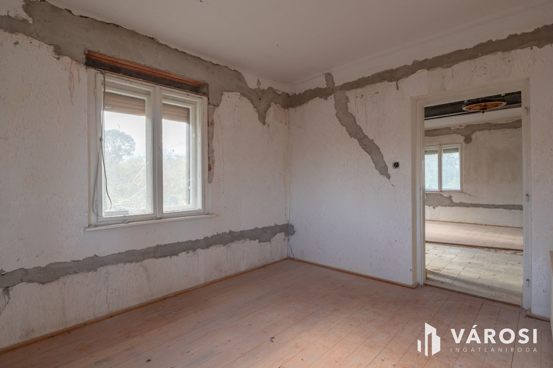 A főépület nettó 90 nm, 2 szoba és egy újonnan kialakított tágas világos tér, ahol a nappali, étkező és konyha kerülhet kialakításra.