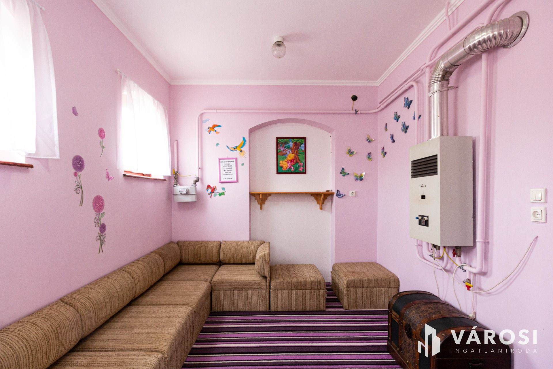 Az emeleti társalgó és a három szoba padlószőnyeges, a többi helyiség hidegburkolatú.