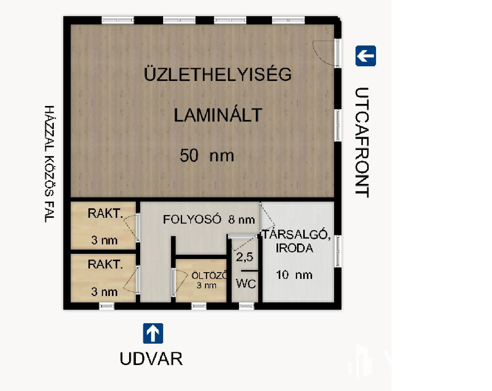 A 81 nm-es üzlethelyiség főbejárata az utcáról nyílik, de van egy bejárata az udvar felől is.