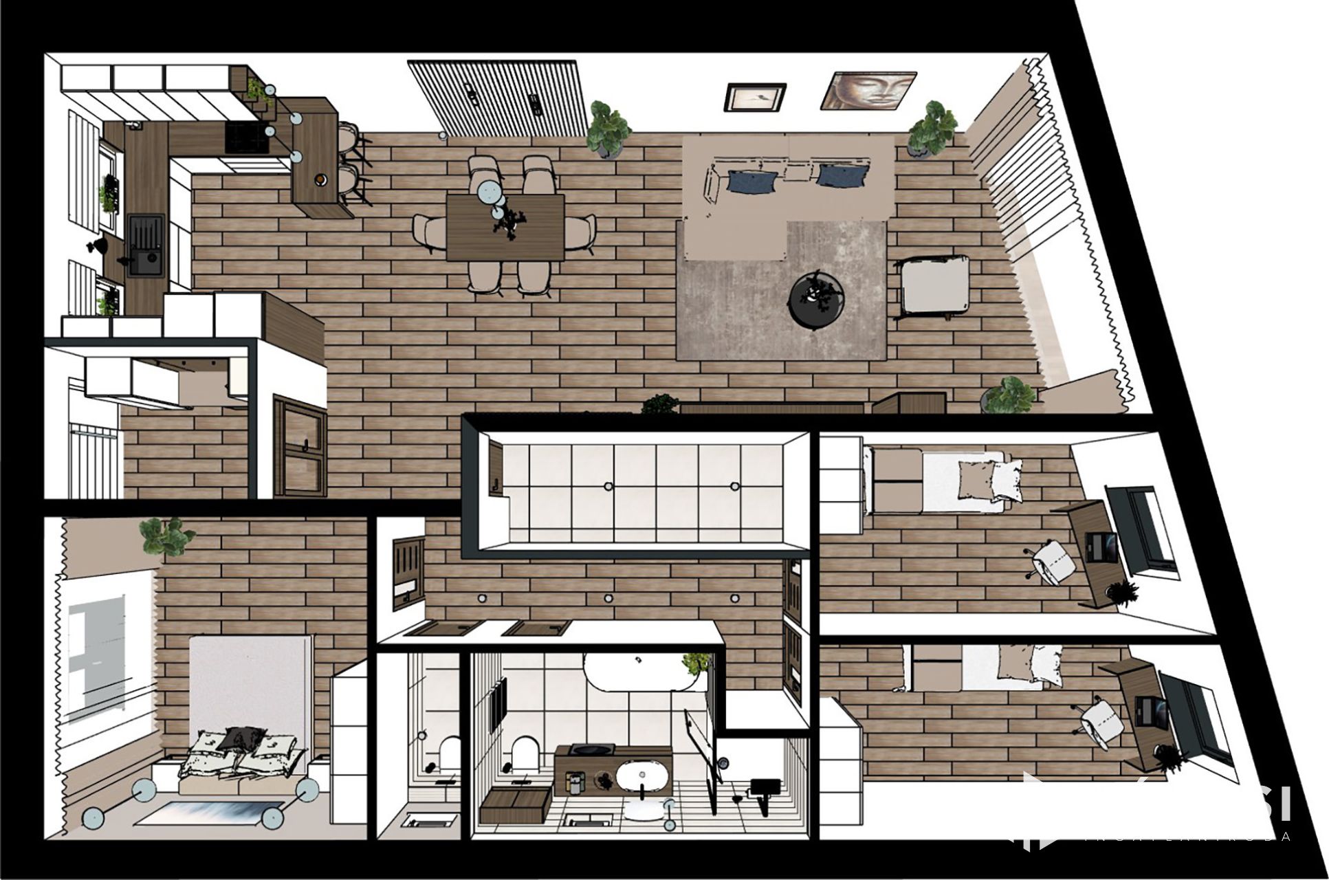 - ~100 m2 privát, csak a tulajdonosok számára elérhető, medence és napozó-játszó tér