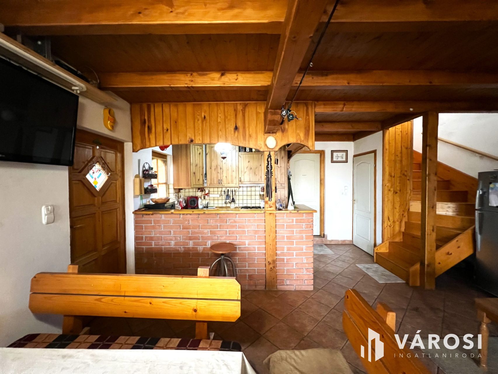 A természet közeliség megjelenik a házon belül is, sok faanyag került beépítésre, gerendázott mennyezete is az otthonosság érzetét növeli.