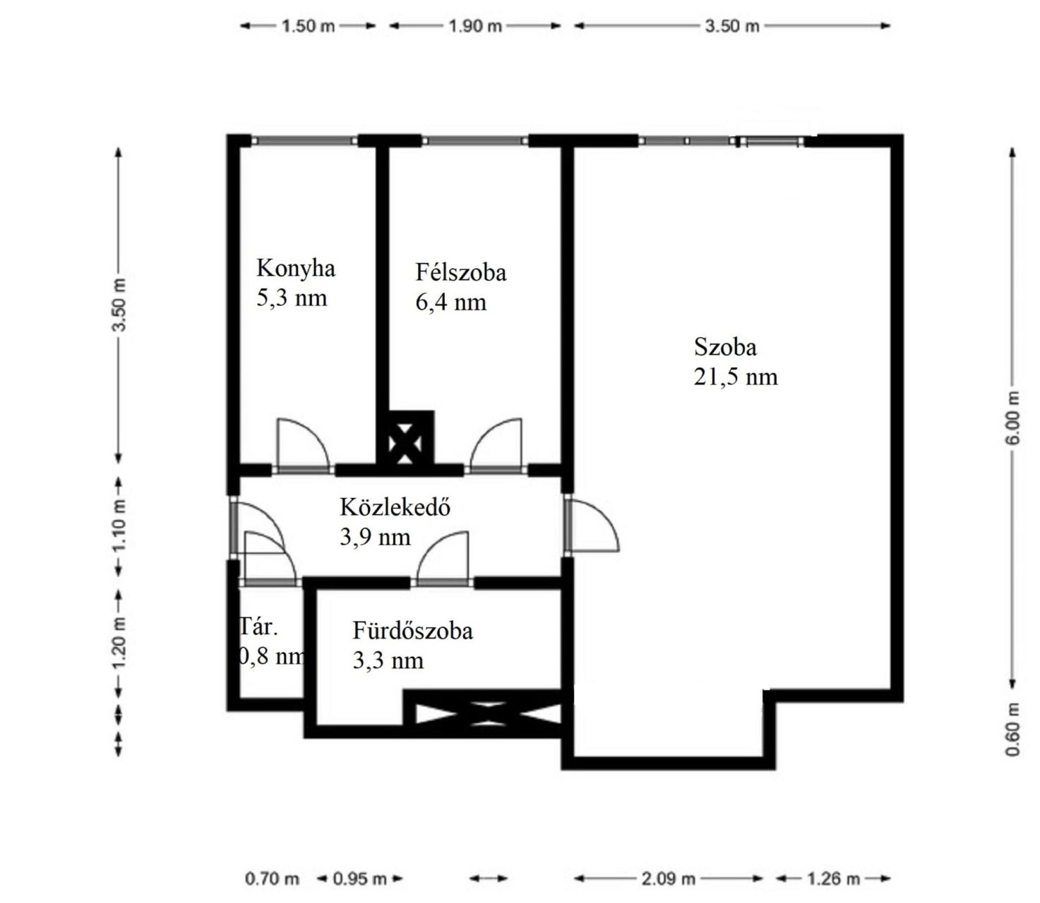 Belső lakrész helységei: közlekedő, kamra, fél szoba, szoba, konyha, fürdő mellékhelységgel együtt.