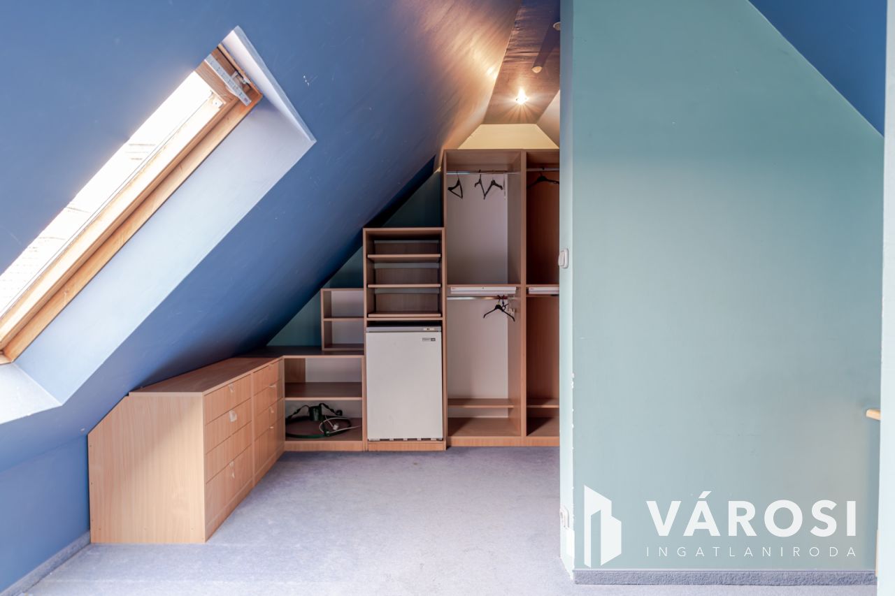 A nappaliból egy kényelmes lépcső vezet fel az emeletre, ahol egy egybenyitott, sokoldalúan alakítható tér található. Jelenleg egy hálórész, dolgozósarok és gardrób kapott itt helyet, de könnyedén két különálló szobává alakítható - tökéletes gyerekszobának vagy akár egy extra hálónak.