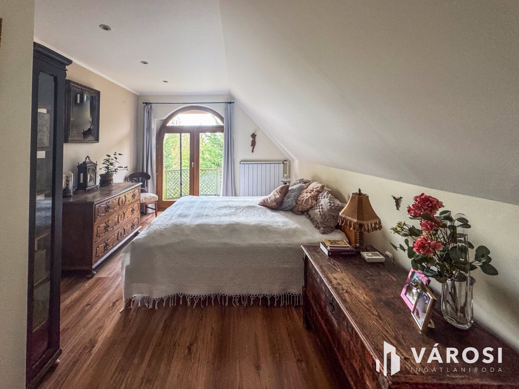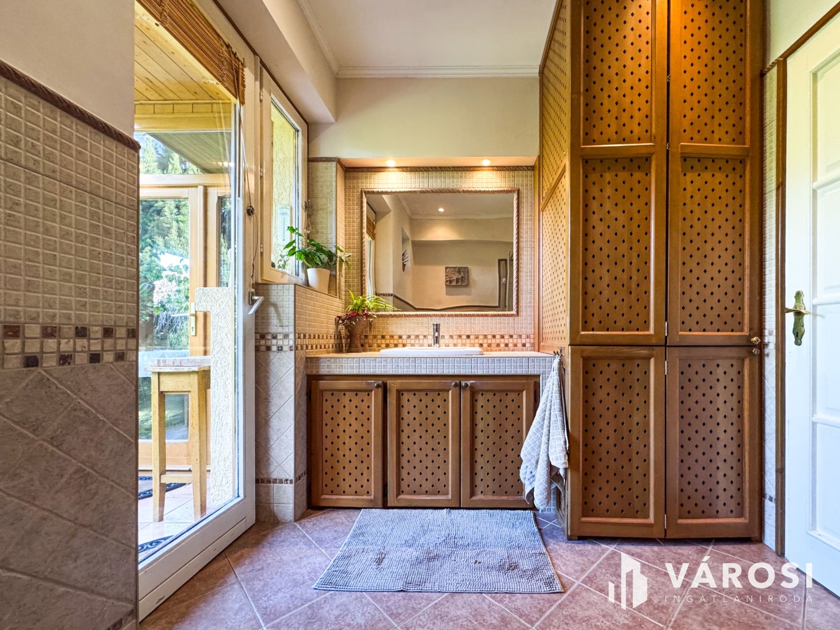 A kert igazi paradicsom a zöldövezeti életérzés kedvelőinek: fúrt kút és automata öntözőrendszer biztosítja a növények gondozását. A beépített szekrények praktikusan segítik a rendszerezést és a tárolást.