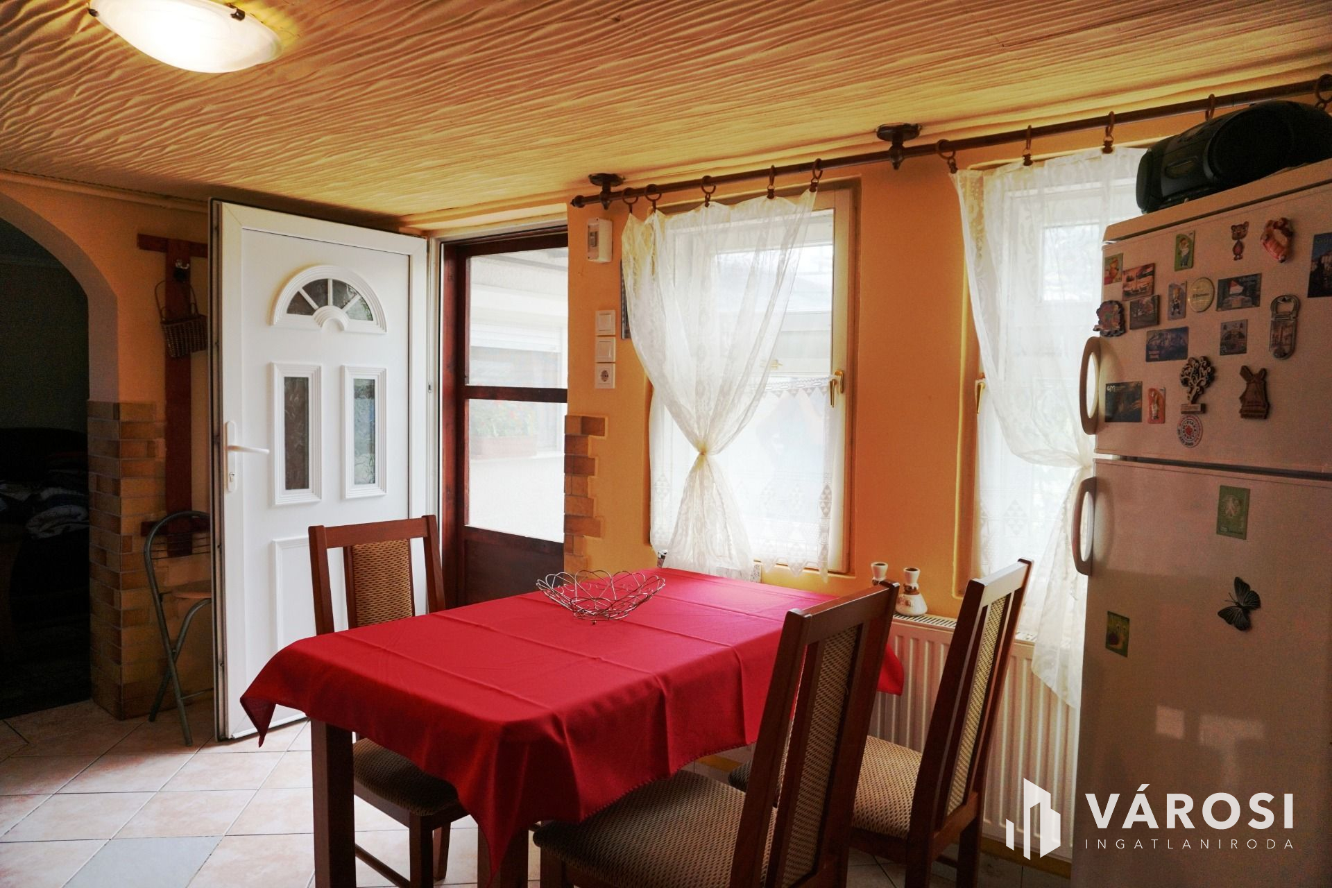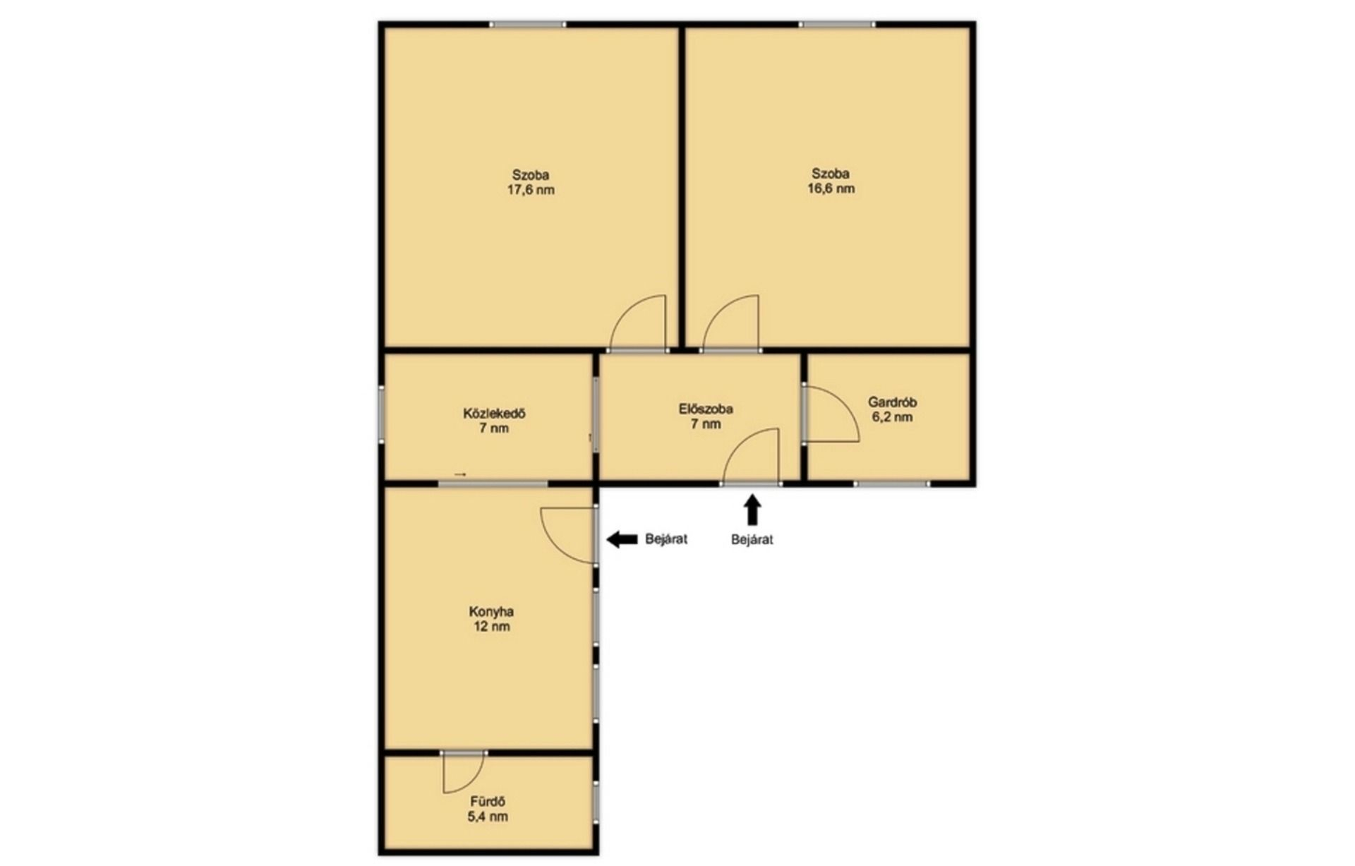 A lakóháznak két bejárata van, az előszoba és a konyha felől is be lehet jutni, minkét ajtó biztonsági záras műanyag bejárati ajtó.