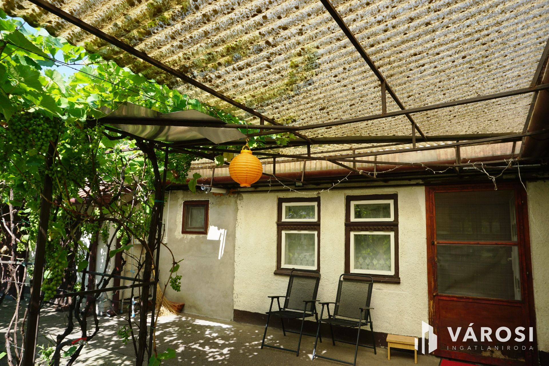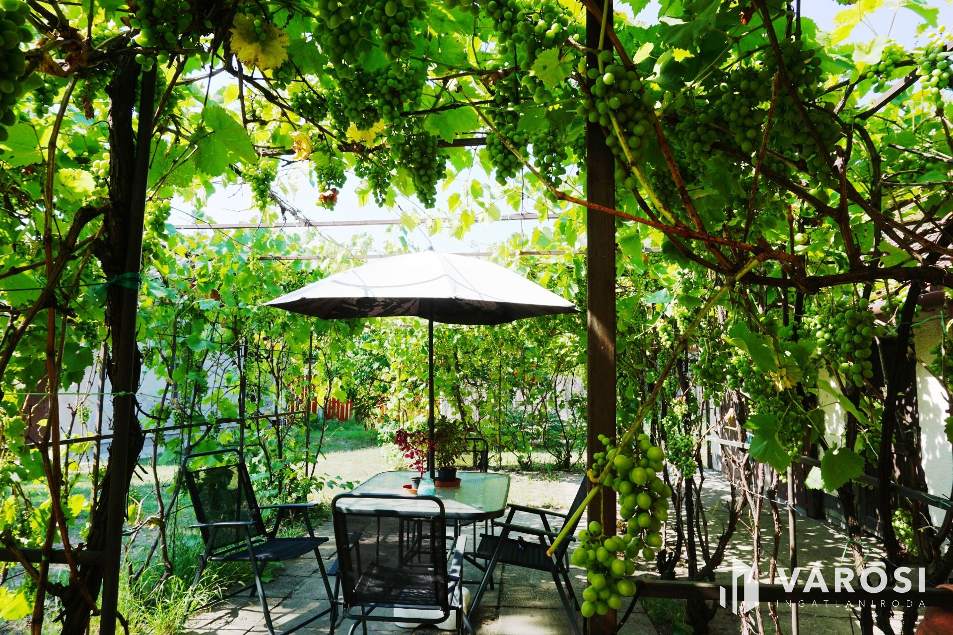 Az épület „L” alakú kialakításának köszönhetően viszonylag zárt részen egy szőlőlugast telepítettek. Egyedi a hangulata. Egy kávé, egy pohár bor, egy vacsora elfogyasztása itt biztosan azt az érzi, hogy „otthon”.