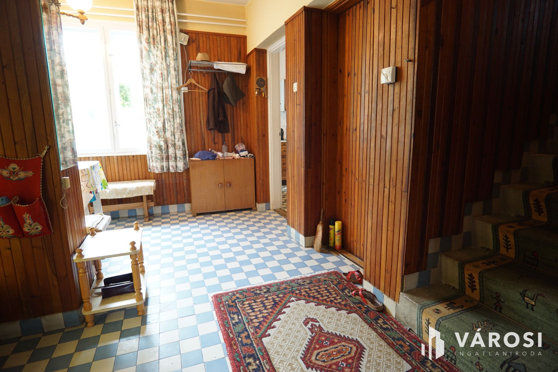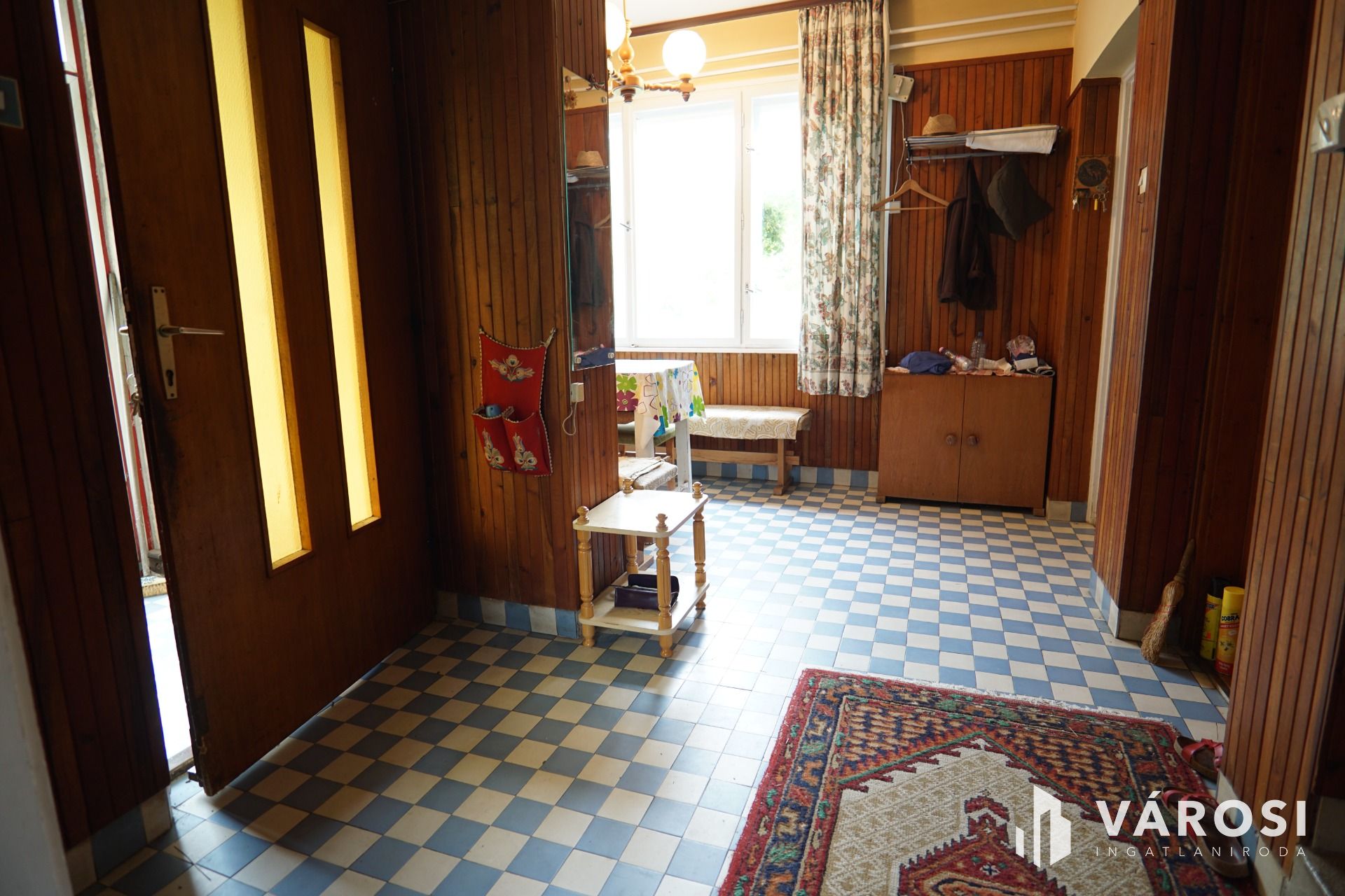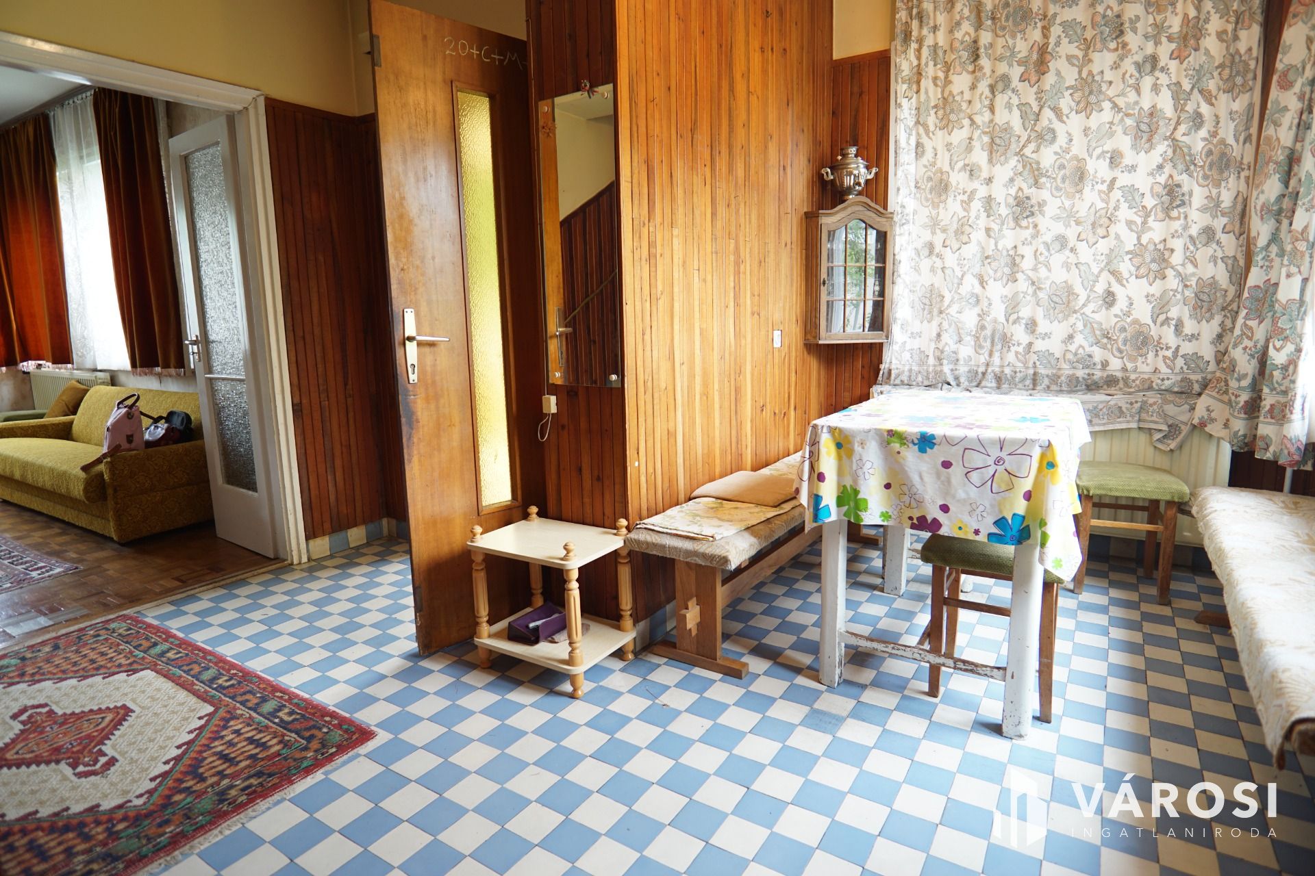Földszint + szuterén: 2 tárolóhelység (szuterén szinten), egy nappali, előtér, közlekedő, étkezősarok, konyha kamrakapcsolattal,