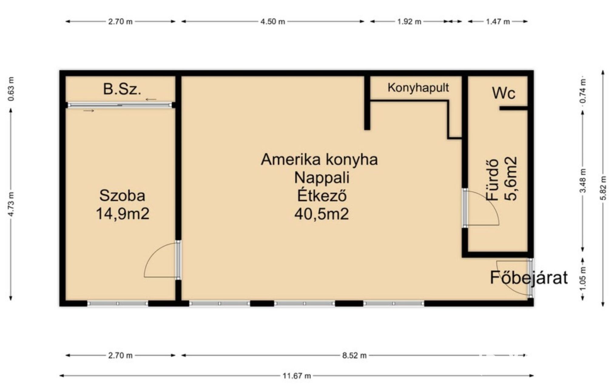 Belső lakrész helységei: 1 szoba, amerikai konyha nappali étkező egy légtérben, fürdő mellékhelységgel együtt.